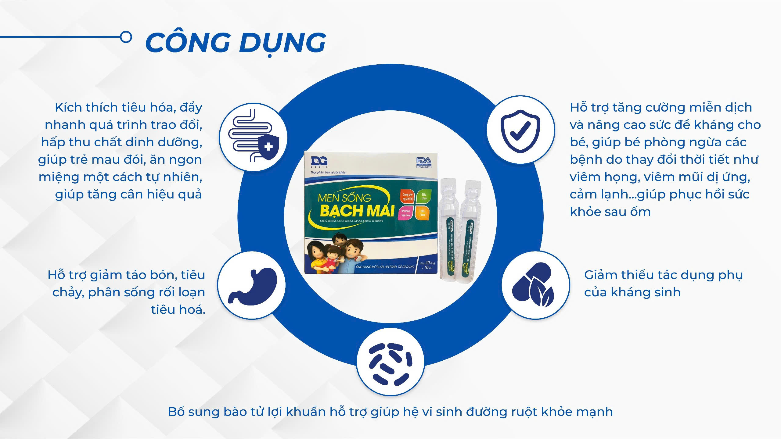 • Kết hợp với kẽm giúp cải thiện nhanh rối loạn tiêu hóa, kích thích ăn uống ngon miệng