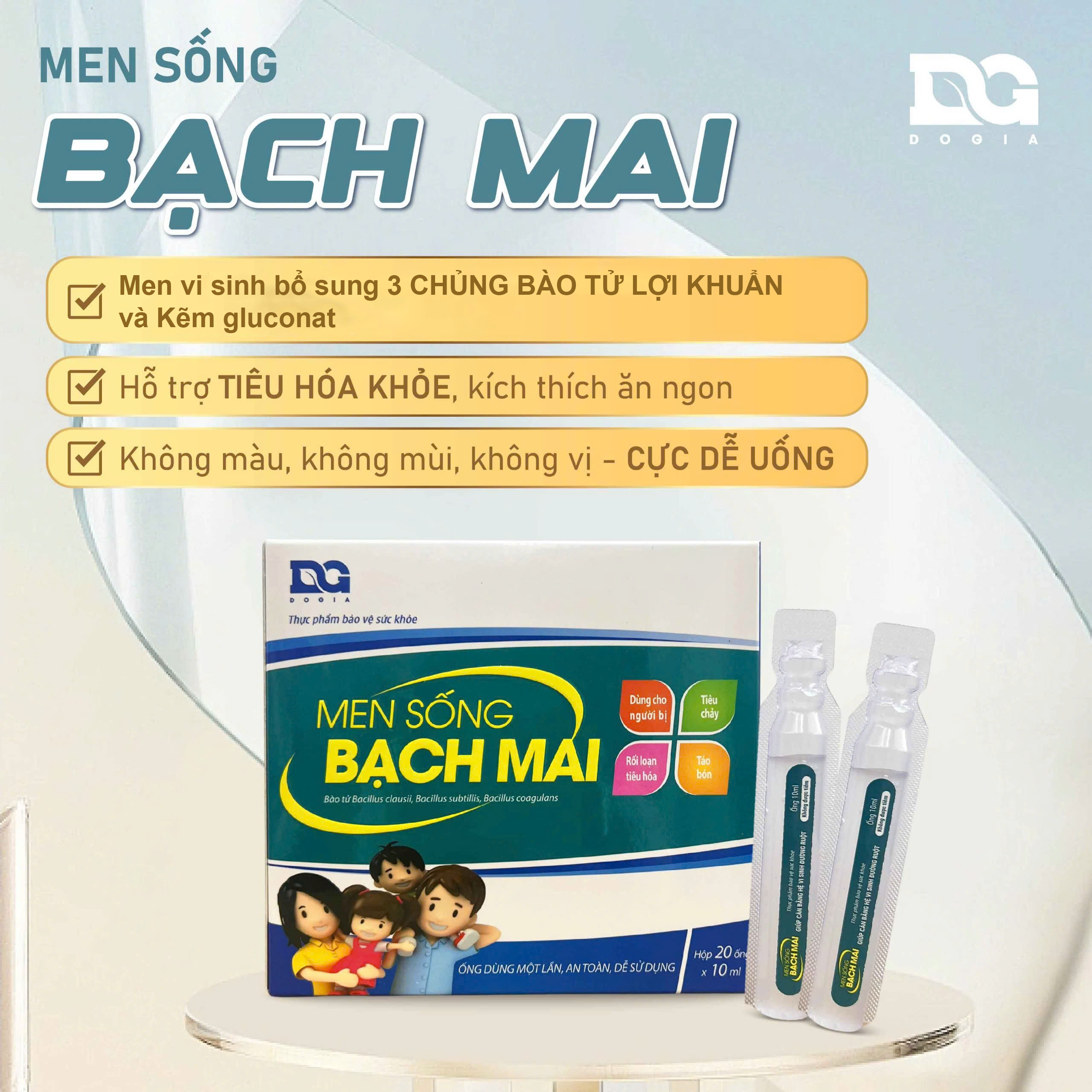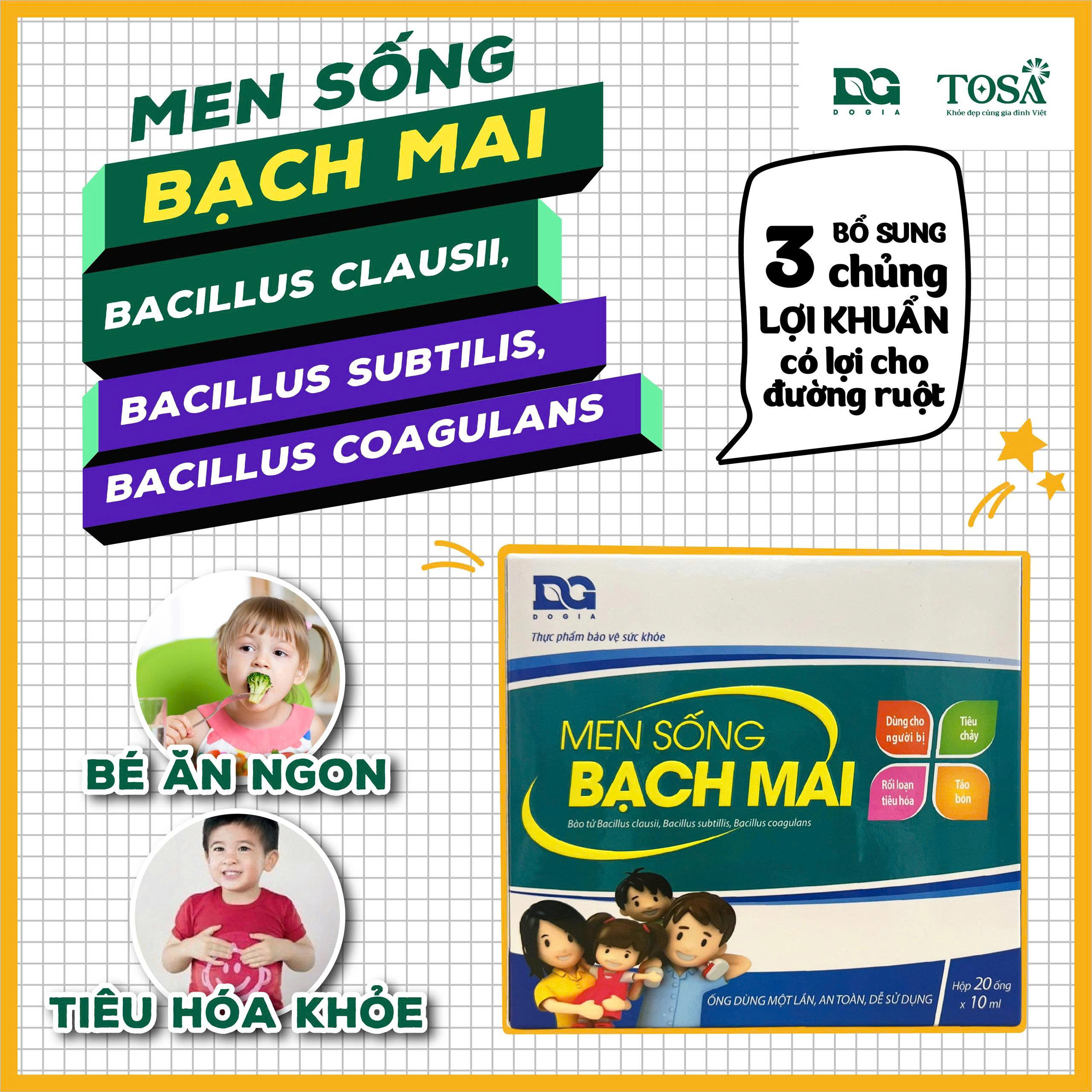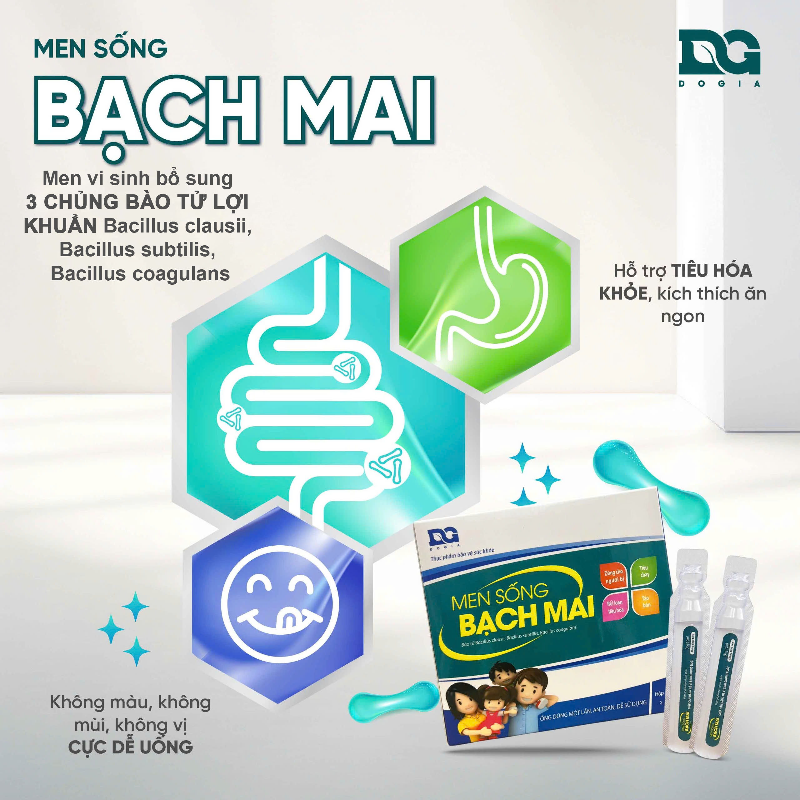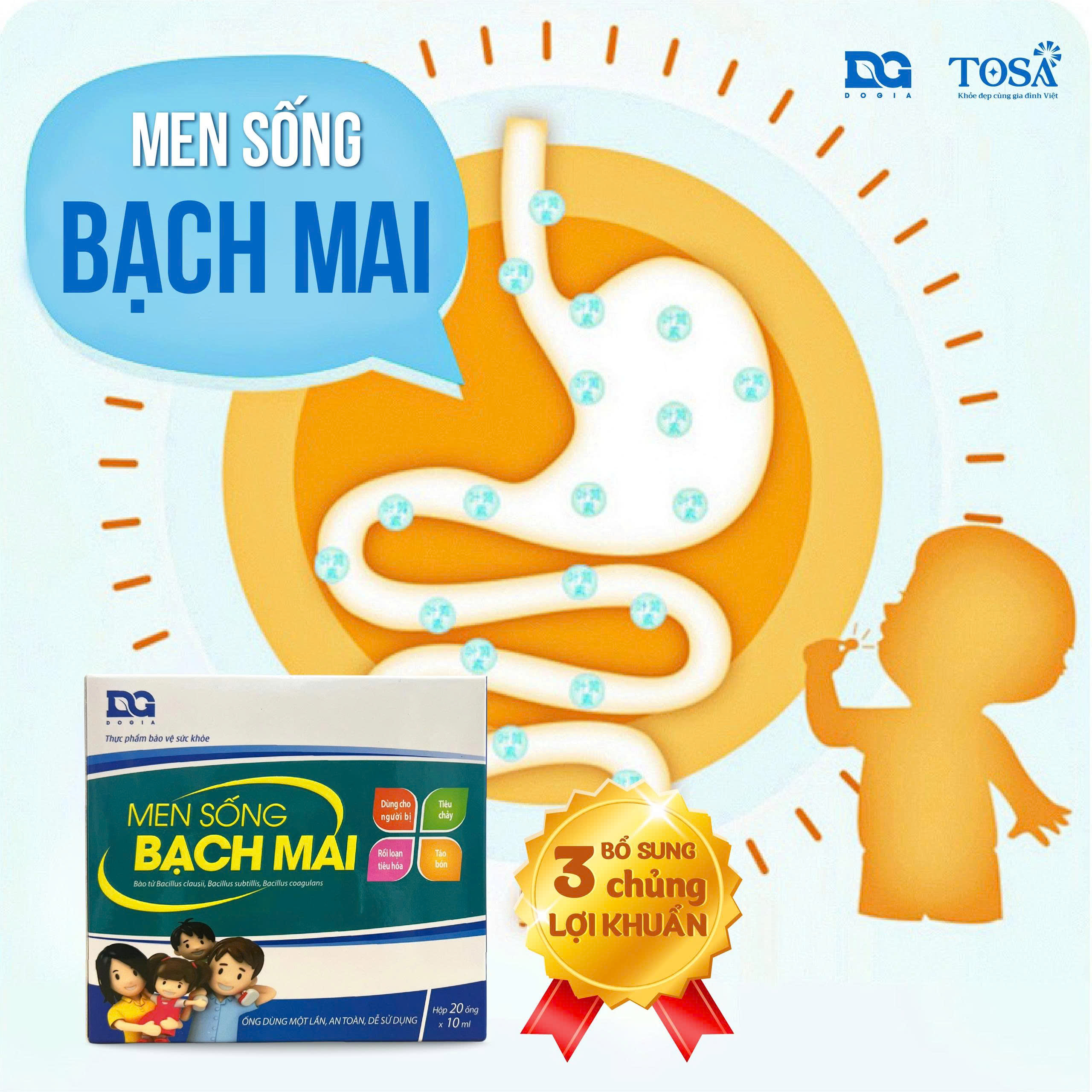 Men Sống Bạch Mai hỗ trợ kích thích tiêu hóa, đẩy nhanh quá trình trao đổi, hấp thu chất dinh dưỡng, giúp trẻ mau đói, ăn ngon miệng một cách tự nhiên, giúp tăng cân hiệu quả. Hỗ trợ giảm táo bón, tiêu chảy, phân sống rối loạn tiêu hoá, giảm thiểu tác dụng phụ của kháng sinh.